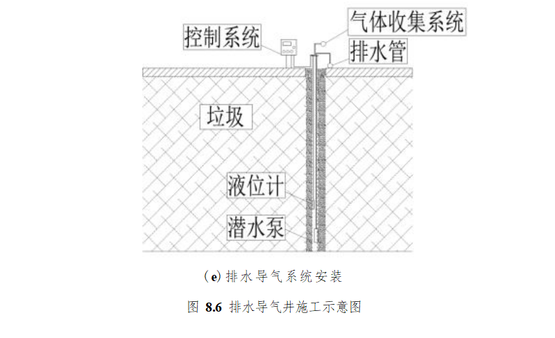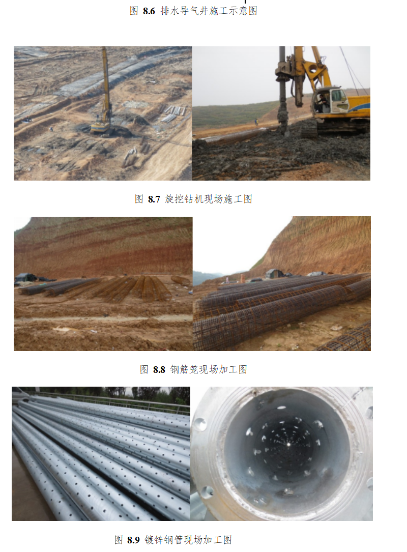 排水导气井的施工过程主要包括旋挖钻机开孔、钢筋笼下设、排水导气管下设、填充 碎石和排水导气系统安装等步骤,如图 8.6 所示。