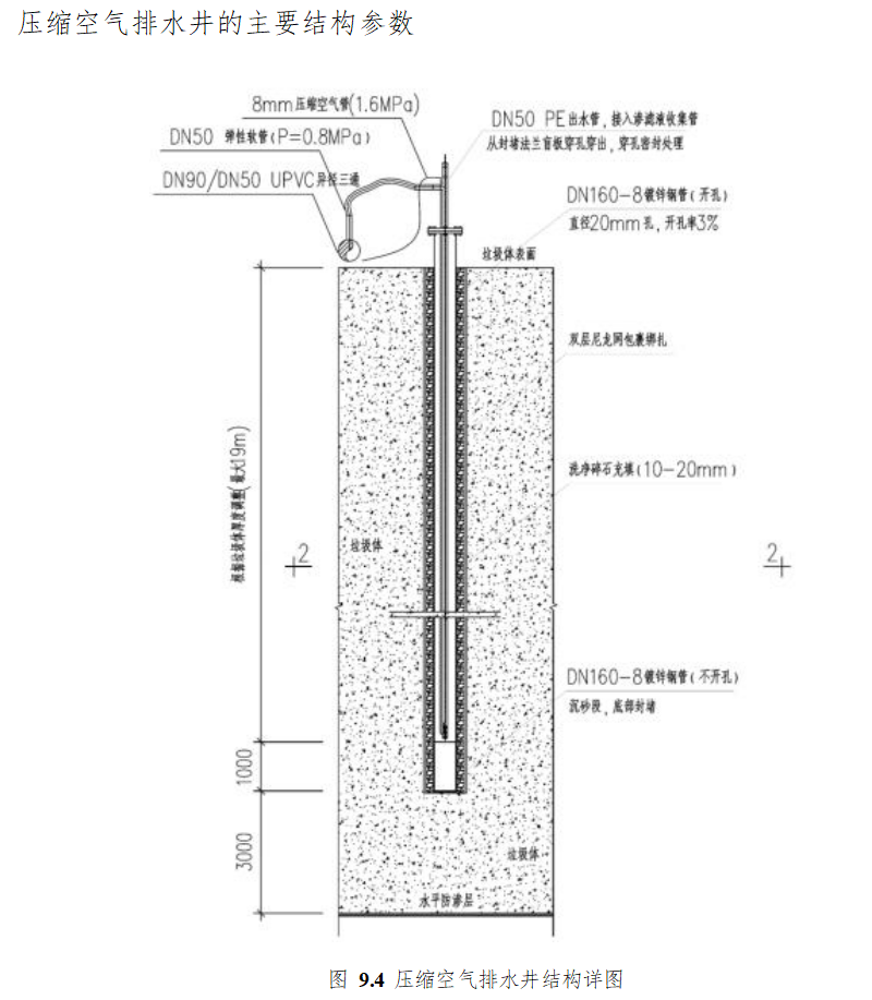 压缩空气排水井的主要结构如图 9.4-9.5 所示。压缩空气排水井的工作原理是通过高 压气体把排水井内的水汽混合物冲出,导入至排水管网。因此,压缩空气排水井的井头无 需采用黄土密封, 与对体内部的井的结构保持一致。 考虑到垃圾的不均匀沉降以及侧向位 移明显, 为了尽可能的延长排水井的工作寿命, 防止较短时间内井管弯曲而失效。 压缩空