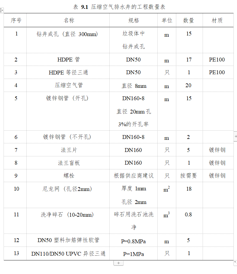 气排水井井管主要采用镀锌钢管, 尽可能的增加井的刚度。由于城市固废组分复杂, 为了 防止细颗粒物质附着在压缩空气排水井井壁,影响排水井的工作性能, 在镀锌钢管外侧包 裹双层尼龙网,井管的底部设置 HDPE 堵头。 由于压缩空气排水井的钻孔直径为 300mm, 井内镀锌钢管的直径为 160mm ,在钢筋笼和井管之间填充 10-20mm 碎石,以增加排水井 周边的渗透系数,使周边的渗滤液能够有效渗流至井内 (见图 9.5)。 压缩空气排水井的 数目较多且单井日均导排量相对较小,为了节省造价, 不对每一口压缩空气排水井设置独 立的液位显示系统和流量控制系统。以 15m 深的压缩空气排水井为例, 表 9.1 罗列了压缩 空气排水井所需的各配件的工程数量表。