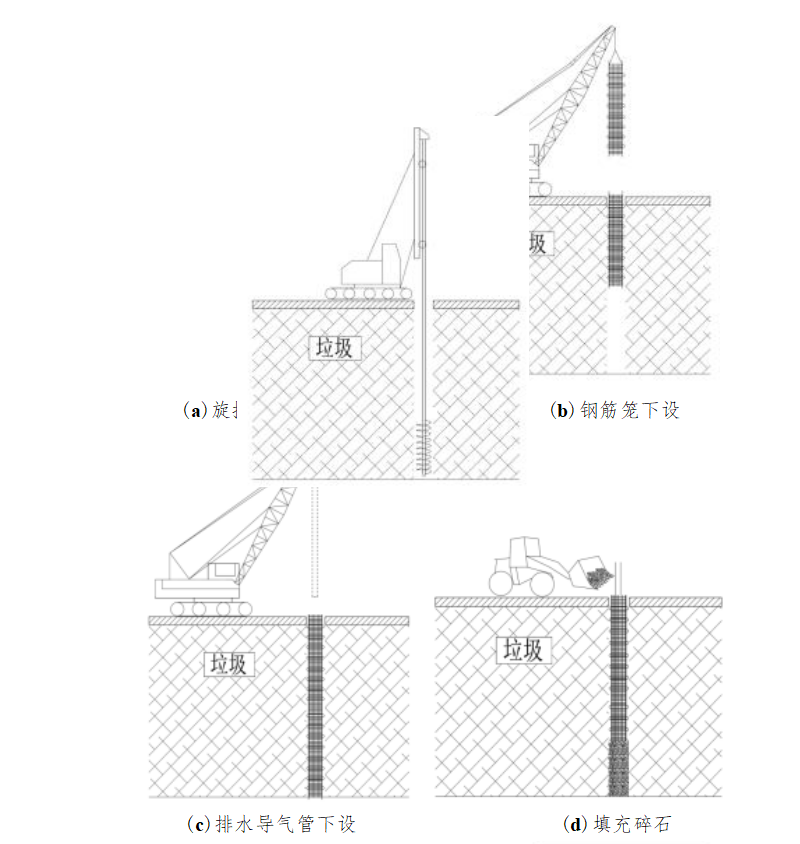 排水导气井的施工过程主要包括旋挖钻机开孔、钢筋笼下设、排水导气管下设、填充 碎石和排水导气系统安装等步骤,如图 8.6 所示。