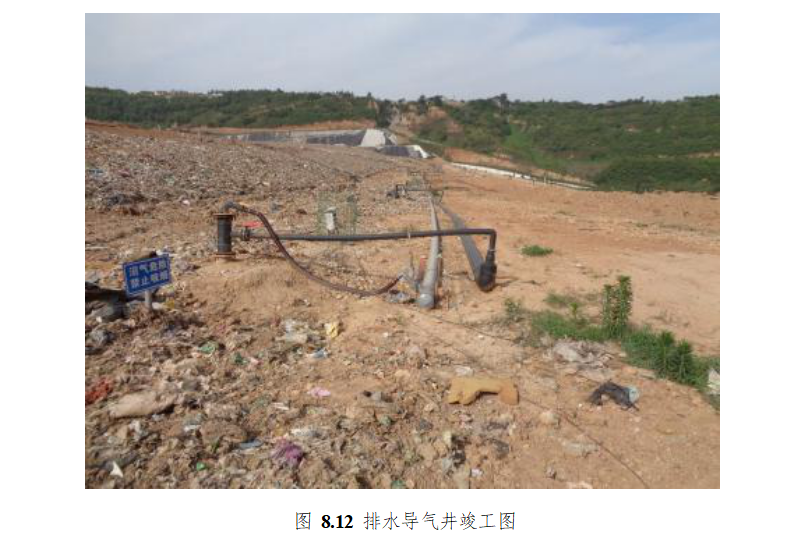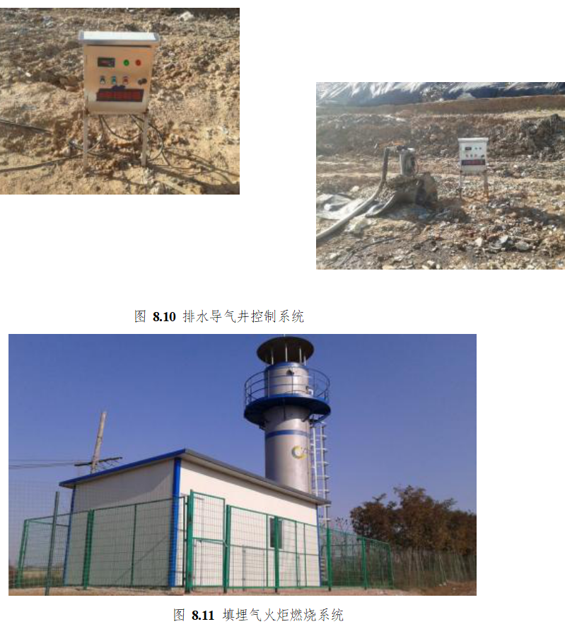 (e)排水导气系统安装: 由深井潜水泵、液位计、潜水泵配电系统、潜水泵控制系 统、排水管网和填埋气收集系统组成, 其中潜水泵采用不锈钢材料, 泵的外径为 140mm, 最大流量为 5m³/h,扬程为 45m,功率为 2.2kw。井内供电电缆和液位计探头及电缆需满 足井内填埋气防爆要求。 由于每口井的渗滤液导排情况不同, 因此起泵和停泵的时间均会 有所差异,在每一口井均配置了各自的控制系统,见图 8.10 所示。由于对体内的填埋气 和渗滤液相互阻滞, 当渗滤液导排后填埋气的导气系数会明显提升, 大量填埋气会通过井 口导排出来。为了减少填埋气对周边大气环境的污染以及有效防止填埋气的爆炸, 在排水 导气井井口连接填埋气收集设备, 尽可能的把填埋气收集处理。由于该处填埋气产量不大, 利用效率达不到资源化回收的要求。因此, 排水导气井井口直接与填埋气的火炬燃烧系统 连接(见图 8.11) ,把多余的填埋气通过燃烧系统转化成对环境没有污染的二氧化碳和水。 排水导气系统安装完成后可同时对填埋气和渗滤液进行抽排,排水导气井竣工图见图 8.12。考虑到填埋场的场地条件及堆体厚度,在现场一共安装 10 口排水导气井,平台两 侧的垃圾厚度较小,平均井深为 20m,其余各孔均达到 30-40m,各井的编号及深度见表 8.2。