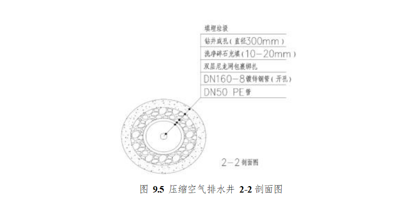 压缩空气排水井的主要结构如图 9.4-9.5 所示。压缩空气排水井的工作原理是通过高 压气体把排水井内的水汽混合物冲出,导入至排水管网。因此,压缩空气排水井的井头无 需采用黄土密封, 与对体内部的井的结构保持一致。 考虑到垃圾的不均匀沉降以及侧向位 移明显, 为了尽可能的延长排水井的工作寿命, 防止较短时间内井管弯曲而失效。 压缩空