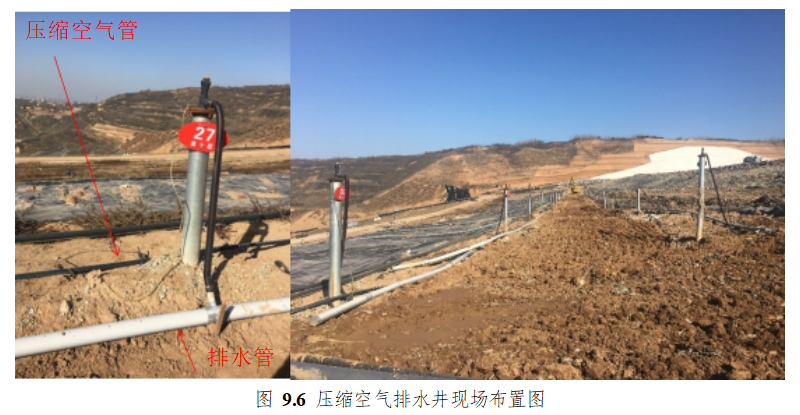 (d) 井内管线布置:压缩空气排水井主要通过往压缩空气管注入高压气体,高压气 体沿着排水管附带出水汽混合物。由于压缩空气管的出口附着在井内排水管的底部,因此 高压气体会把水气混合物从排水管的底部冲至管口,进而进入外部的导排管网。如图 9.7 (d) 所示,黑色管材为排水管, 白色透明管为压缩空气管,在排水井的井内,全段排水 管的外侧绑扎压缩空气管,并且压缩空气管从排水管的底部绕进排水管内部。根据现场经 验,压缩空气管顶部固定在距离排水管底面50cm 处出水效果较好;