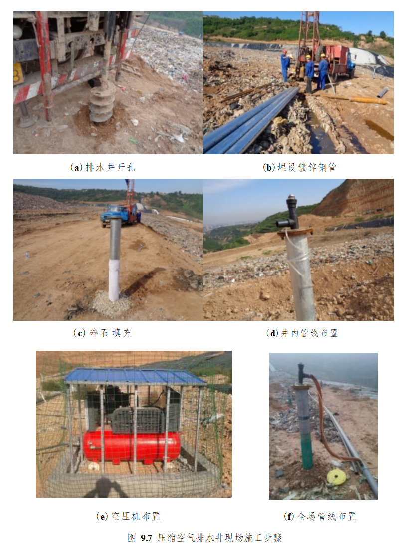 (b) 埋设镀锌钢管:因为垃圾堆体存在不均匀沉降和侧向滑移,为避免管材受垃圾 侧向推力作用而发生弯折破坏, 压缩空气排水井的内部均布置直径 160mm 的镀锌钢管。 为了井壁周边的渗滤液能够有效渗流至井内, 在镀锌钢管的井壁上开设钻孔, 钢管的开孔