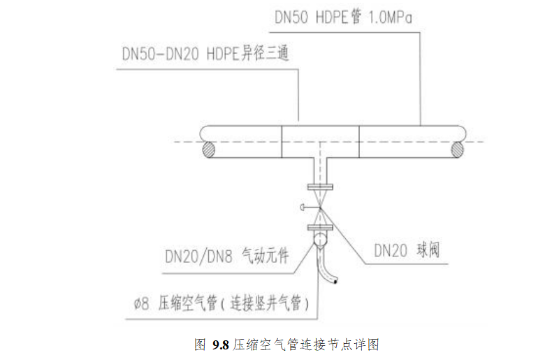 (f) 全场管线布置:每一口压缩空气排水井的排水管均需连接至排水管网,经由排 水管网汇总至渗滤液导排主管; 每一口井的压缩空气均由直径为 50mm 的 HDPE 管从空压 机通至井口处, 通过 DN50-DN20 三通管件把 50mm 的压缩空气管管径变化至 20mm 压缩 空气管,如图 9.8 所示, 然后与 DN20-DN8 连接,把 20mm 的压缩空气管管径变化至 8mm